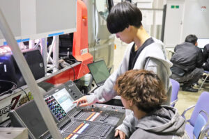 学生の声:初めての現場でとても緊張しましたが、音を出した瞬間に会場が盛り上がるのを見て、“音響ってやっぱりすごい!”と思いました。先輩なしの一年生チームでやりきれたのが嬉しいです!(音響ミュージック科1年)