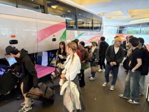 朝早い集合にもかかわらず、学生たちは元気いっぱいで、バスの中でもすでに盛り上がっていました🚌