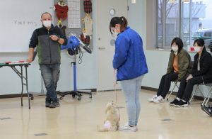 その後の実習では、飼い主さんと共にさまざまな場面で落ち着いていられるように、いろいろな人や生き物、物や音に慣れさせる犬の社会化トレーニングや、吠え癖、噛み癖の改善トレーニング方法をデモンストレーションして頂きながら学ぶことができました。