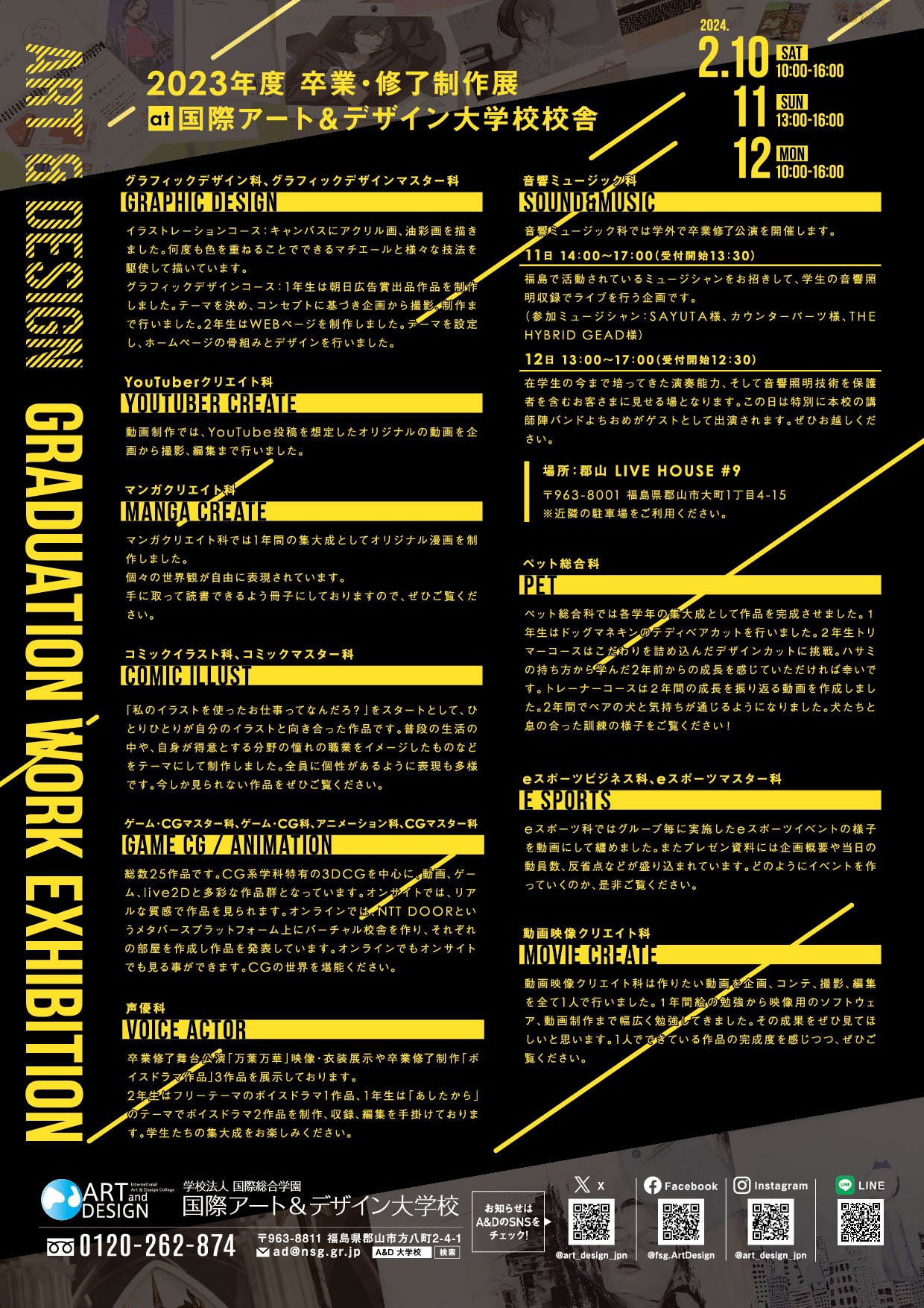 是非、ご家族や友人をお誘いの上、卒業・修了制作展に足を運んでいただき、学生たちの輝かしい成果をご覧ください。