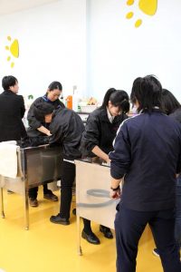 こちらは自宅で飼われているワンちゃんを、実際に学校まで連れてきて頂き、先生達と一緒に、学校の設備をつかってシャンプー体験を行うものとなります(^^♪